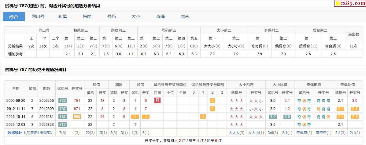 > 323期福彩3D试机号787对应开奖号的组选分析结果